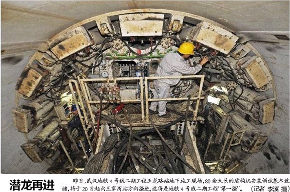 新聞圖片拍攝于鐘鑫公司玉龍路地鐵項(xiàng)目部地下施工現(xiàn)場(chǎng),報(bào)道以“潛龍?jiān)龠M(jìn)”題,把漢陽(yáng)市政一號(hào)盾構(gòu)機(jī)比作潛入地下的長(zhǎng)龍,蓄勢(shì)待發(fā),在即將開始的盾構(gòu)掘進(jìn)施工中大顯身手。報(bào)道在文中指出,盾構(gòu)機(jī)調(diào)試工作基本就緒,將開始武漢地鐵4號(hào)線二期工程“第一掘”。