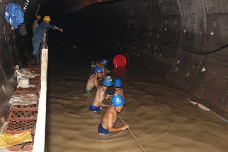 7月7日災(zāi)情發(fā)生后,玉龍路地鐵東段頭井基坑積水?dāng)?shù)米深,項(xiàng)目部立即投入排水搶修工作,集團(tuán)公司董事長(zhǎng)胡紅勝親自帶隊(duì)搶險(xiǎn),抽調(diào)十余臺(tái)大型抽水泵、25噸泵車(chē)到施工現(xiàn)場(chǎng),項(xiàng)目經(jīng)理及現(xiàn)場(chǎng)管理人員一人負(fù)責(zé)一臺(tái)抽水泵的拼裝,綁鐵絲、擰螺絲,自己動(dòng)手,公司總經(jīng)理王智高、支部書(shū)記王繁親自安排抽水泵下井工作,經(jīng)過(guò)三十多個(gè)工人三天的艱難搶險(xiǎn),終于將隧道中積水排出,一個(gè)星期后成功搶救出被淹沒(méi)的盾構(gòu)機(jī)。之后盾構(gòu)維修人員不畏艱難,跟泥土和水災(zāi)作戰(zhàn),將一個(gè)個(gè)零件拆下來(lái)進(jìn)行清洗檢修,公司還從海瑞克公司專(zhuān)門(mén)聘請(qǐng)兩名專(zhuān)職技術(shù)人員現(xiàn)場(chǎng)指導(dǎo)維修,電氣系統(tǒng)更換配件,重新調(diào)試,液壓系統(tǒng)也送到專(zhuān)業(yè)維修機(jī)構(gòu)進(jìn)行清洗維修,一個(gè)多月里解決了一個(gè)又一個(gè)難題,終于將盾構(gòu)機(jī)修好,具備再次始發(fā)的條件。
