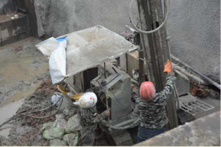 (圖為方紫微同志、涂軼銘同志向嚴(yán)悌文同志介紹施工情況)
