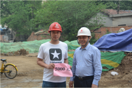 (圖為項(xiàng)目部經(jīng)理彭軼同志接受集團(tuán)公司“五一”勞動節(jié)慰問金)