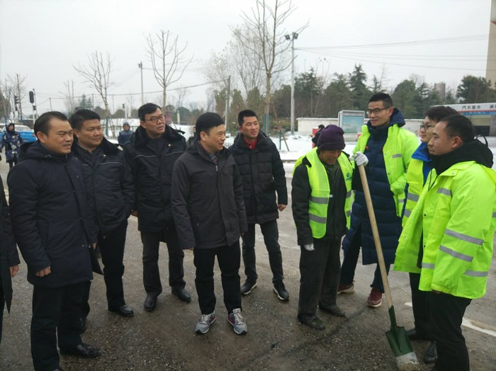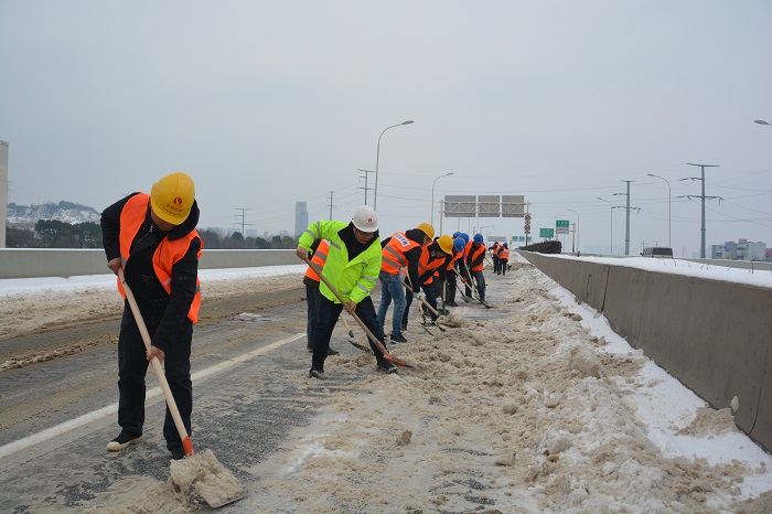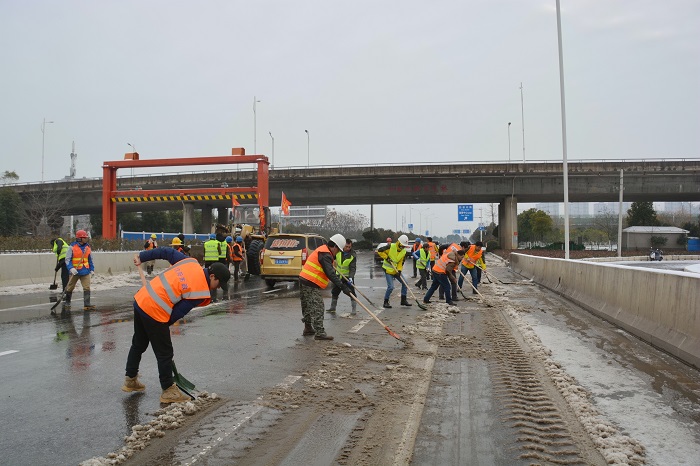 時(shí)間來到28日上午8時(shí),在三環(huán)線百威路—長豐橋路段,鐘鑫公司迅速調(diào)度六大項(xiàng)目部150人和鏟車、農(nóng)用車數(shù)臺(tái),集體前往三環(huán)線高架進(jìn)行除雪破冰。8點(diǎn)鐘的三環(huán)線高架,格外清冷,最低溫度甚至達(dá)到了零下6度!可是當(dāng)你置身于搶險(xiǎn)現(xiàn)場(chǎng)時(shí),卻完全感覺不到寒意——只因?yàn)榇蠹胰硇牡耐度氲綋岆U(xiǎn)工作中,一把把鐵鍬揮舞得那么有力,一條條產(chǎn)雪破冰后的路面是那么干凈整潔,現(xiàn)場(chǎng)氣氛是那么的熱烈。期間更是迎來了漢陽區(qū)委書記馬澤江、漢陽市政集團(tuán)公司董事長嚴(yán)悌文等領(lǐng)導(dǎo)來到搶險(xiǎn)現(xiàn)場(chǎng)指揮工作,為正在搶險(xiǎn)的“鐵軍”們鼓勁加油,大家干勁更足了,精神更振奮,最終在下午13:30將三環(huán)線百威路—長豐橋路段路面積雪清掃完畢。