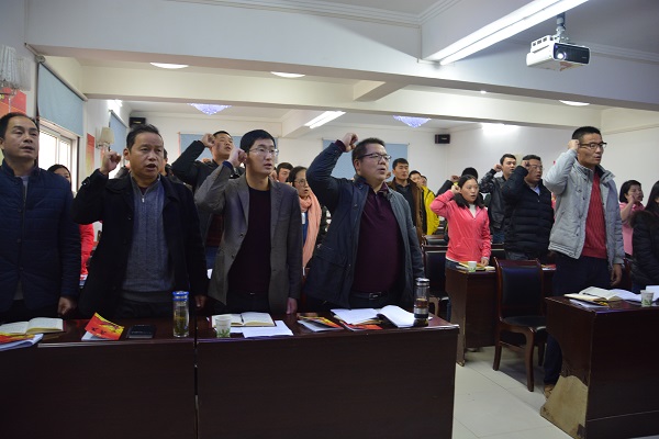 會議伊始,涂書記通報黨員到會和11月份黨費交納情況,全體黨員齊唱國歌。在涂書記帶領(lǐng)下全體黨員重溫了入黨誓詞,一起誦讀黨章第七章《黨的紀律》,聲音鏗鏘有力,高亢嘹亮。