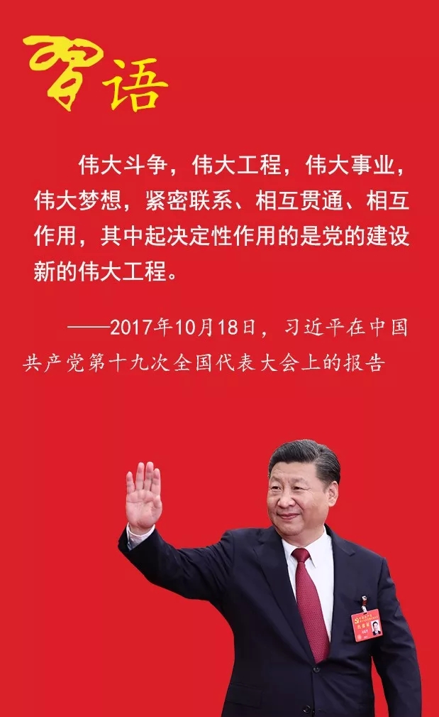 習近平在十九大報告中指出,“偉大斗爭,偉大工程,偉大事業(yè),偉大夢想,緊密聯(lián)系、相互貫通、相互作用,其中起決定性作用的是黨的建設新的偉大工程”。