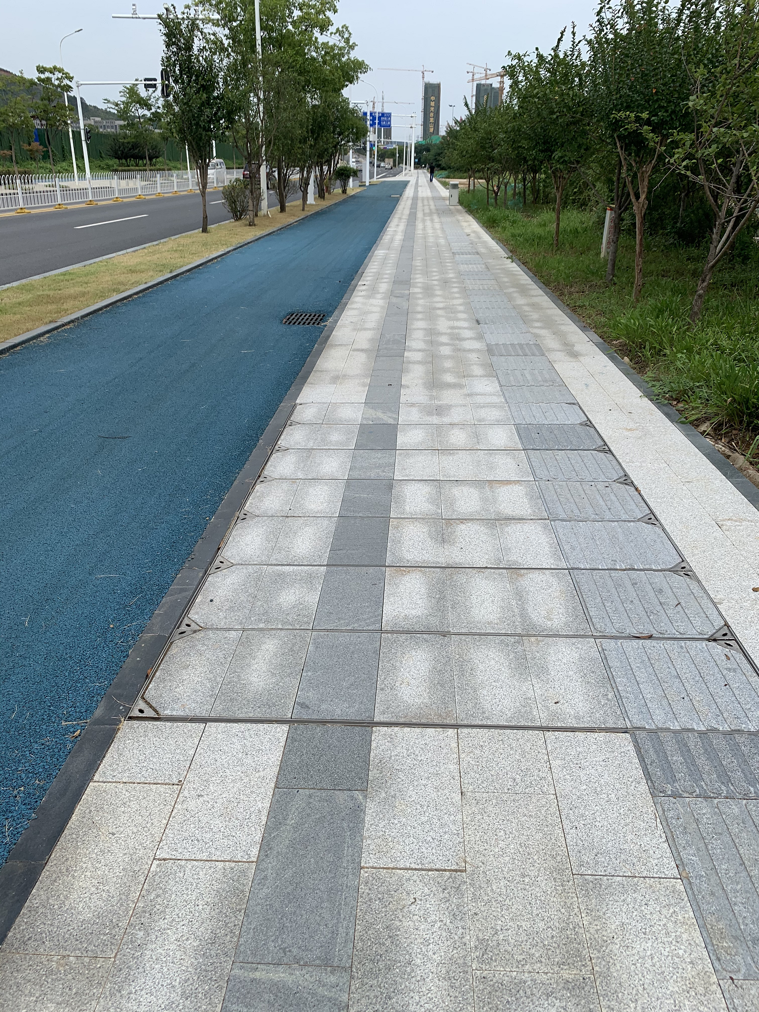 人行道鋪裝面整體采用芝麻灰花崗巖石材。設(shè)置特色芝麻黑條形裝飾帶、芝麻黑盲道,保證縫寬一致、線型直順、平整、美觀。非機(jī)動(dòng)車道加鋪光谷藍(lán)彩色瀝青,不僅耐高溫、耐磨、抗滑,同時(shí)具有低碳環(huán)保的特點(diǎn),形成一道亮麗的風(fēng)景線。