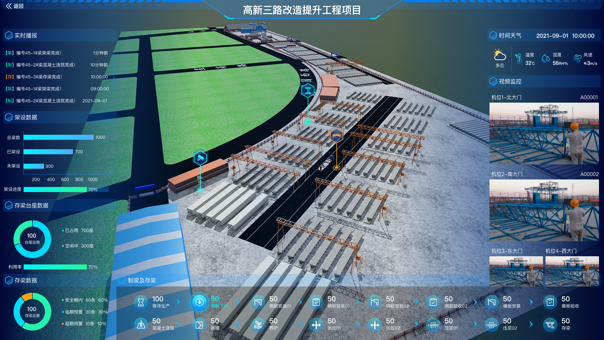 二是智慧梁場系統(tǒng)結(jié)合工程實際、漢陽市政BIM中心,運用視頻監(jiān)控、平臺信息實時掌握材料、制梁、存梁及架設等全過程,平臺系統(tǒng)實現(xiàn)網(wǎng)頁、手機移動端聯(lián)動管理,為橋梁施工提供智慧大腦。